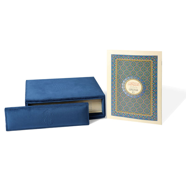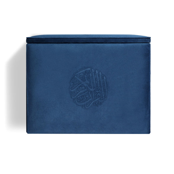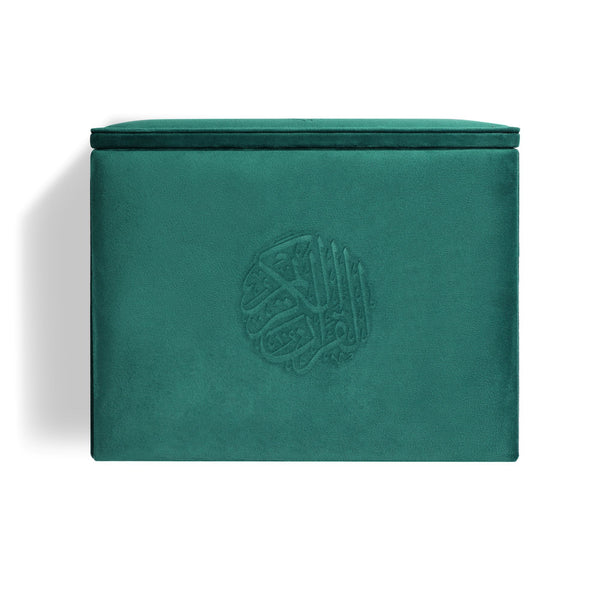 الباكينج مصنوع من قطيفة خضراء او زرقاء ناعمة تعكس الطابع الإسلامي الأصيل، ويحتوي على المصحف الشريف كاملًا مقسمًا إلى 30 جزء بشكل منظم داخل العلبة.