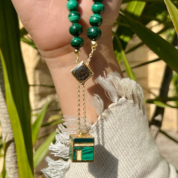As a product expert, I present the mystical "Malakite Third" stone, a unique piece made of silver and gold, bearing the essence of the holiest place in the world, the Kaaba. This stunning piece not only serves as a beautiful accessory, but also carries the spiritual benefits of the Malachite crystal. Experience the divine energy for yourself.